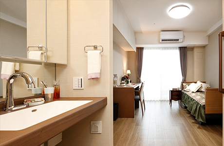 居室設備:介護ベッド、トイレ、洗面台、家具、エアコン、床暖房設置、緊急通報装置