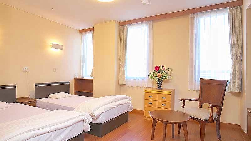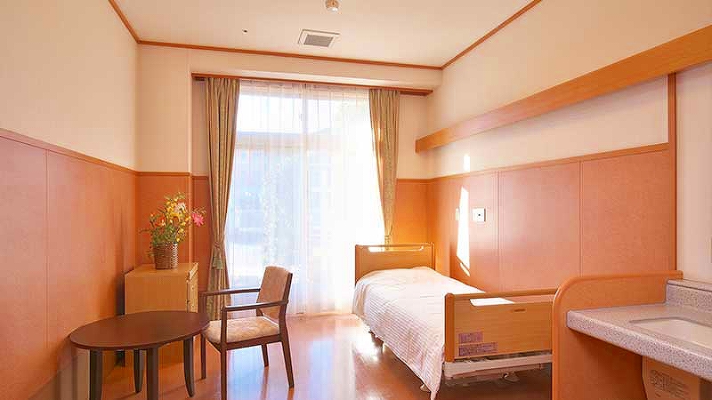 居室設備:温水洗浄器付トイレ、洗面台、キッチン、収納キャビネット、ナースコール、冷暖房完備、カーテン、家具、寝具、介護用電動低床ベッド完備