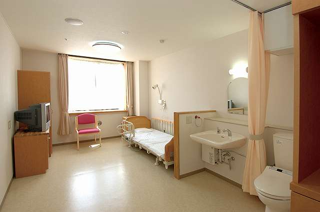 居室設備:エアコン、ナースコール、収納棚、トイレ、洗面台、ベット、イス、ワードロープ、チェスト、カーテン、スプリンクラー