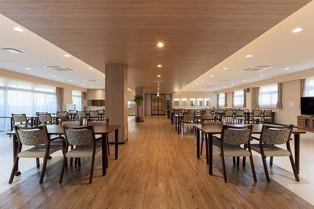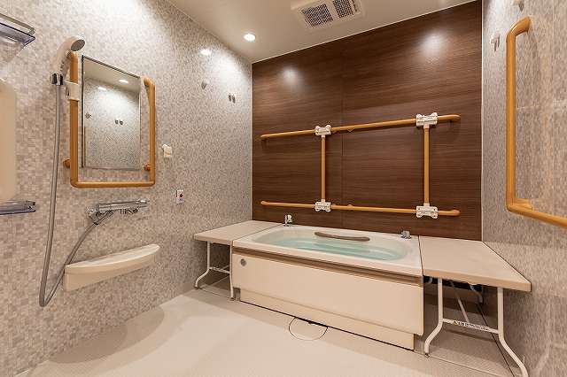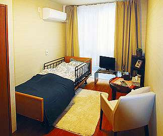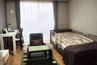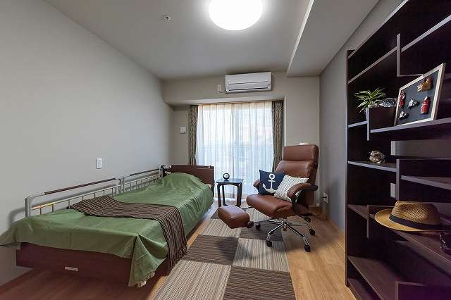 居室設備:バリアフリー設計(手すり設置・段差なし)、温水洗浄機能付トイレ、エアコン、電動介護ベッド(寝具付)、カーテン、ケアコール(ハンディコール)、洗面台、クローゼット