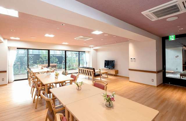 居室設備:トイレ、エアコン、ナースコール、フローリング、BSアンテナ、CSアンテナ、フラットフロア、地上波アンテナ、引き戸式ドア(玄関)、温水洗浄機能付きトイレ、玄関ディスプレイ、車椅子対応トイレ、車椅子対応洗面化粧台、避難設備、鏡、防災設備、電気給湯器、電話回線、靴箱