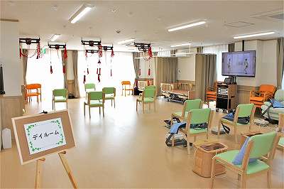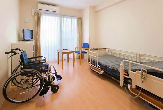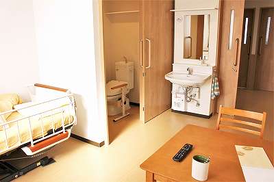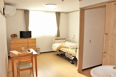 居室設備:全室バリアフリー設計、緊急コールボタン設置、エアコン(加湿機能付)、カーテン、トイレ、洗面台、ハンガーフック、タンス、テレビ
