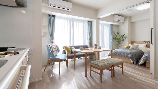 居室設備:キッチン、洗面室、浴室、トイレ、クローゼット、セキュリティインターホン、緊急コールボタン、ライフリズムセンサー 、IHコンロ 、フレッツ光 、冷暖房エアコン 、サポートハンドル 、トランクルーム
