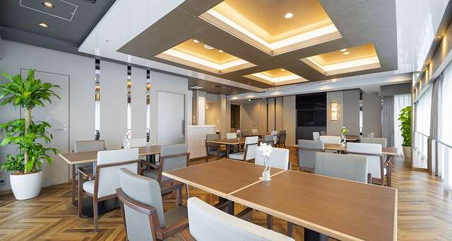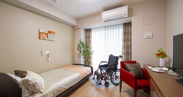 居室設備:緊急コールボタン(ベッド・トイレ)、エアコン、温水洗浄トイレ(背もたれ、両側手すり付)、洗面台、TV端子及び電話機端子、電動ベッド、寝具、カーテン、デスク、チェア、収納 ツインルームのみ:ミニキッチン・ユニットバス・トランクルーム