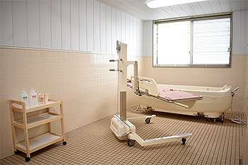 居室設備:スプリンクラー、防火カーテン、緊急コール、介護専用電動ベット、車いす対応洗面台、温水洗浄トイレ、エアコン、収納