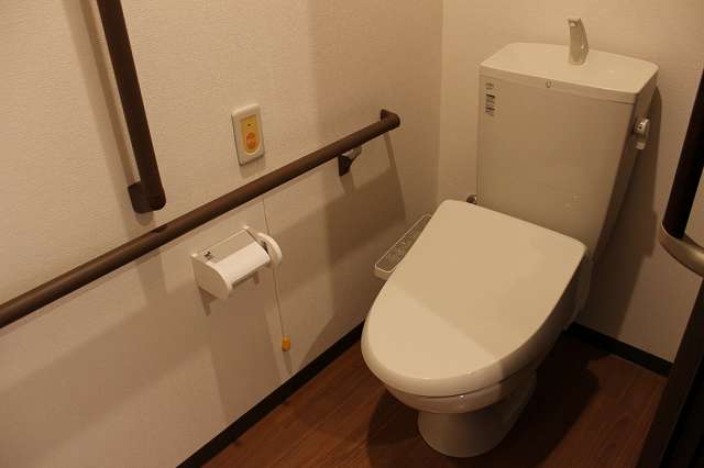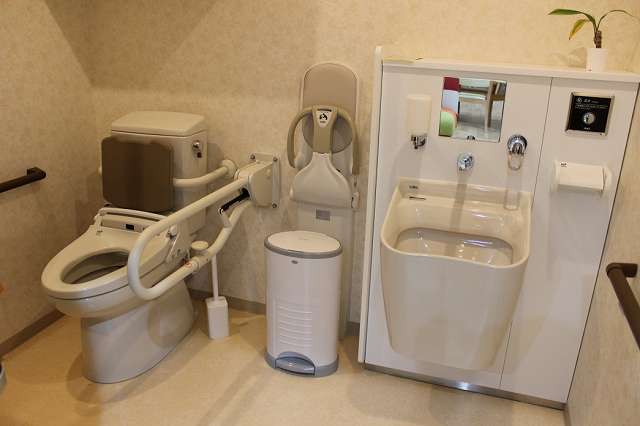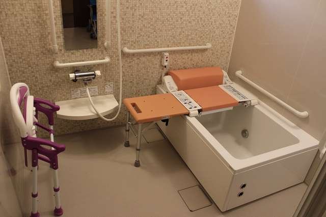 居室設備:トイレ温水便座、エアコン、ナースコール、クッションフロア、バリアフリー、地上波アンテナ、BSアンテナ、冷蔵庫、カーテン、介護用ベッド、引き戸式ドア、照明器具、洗面化粧台、避難設備、防災設備、トイレ内手すり、室内物干し器具、収納、リフト浴、防火カーテン