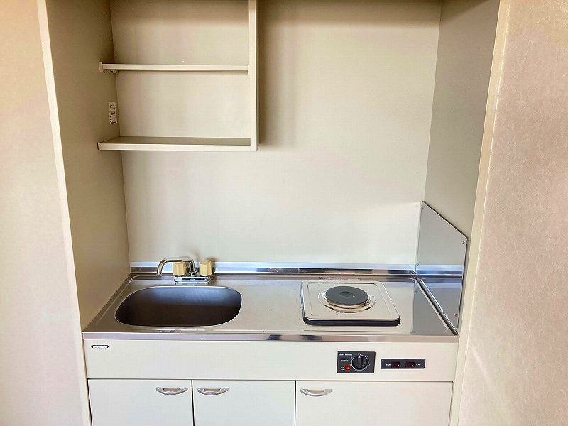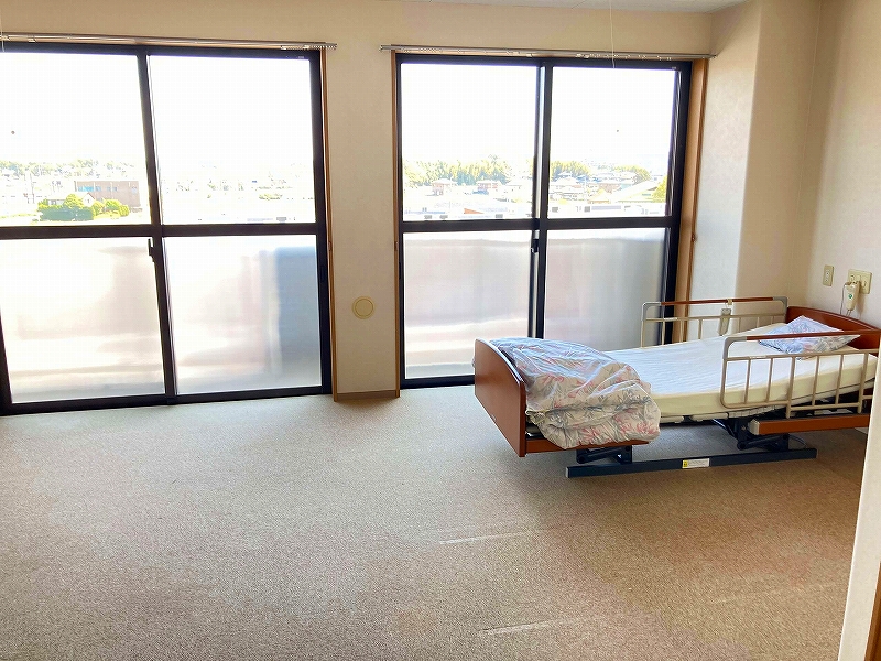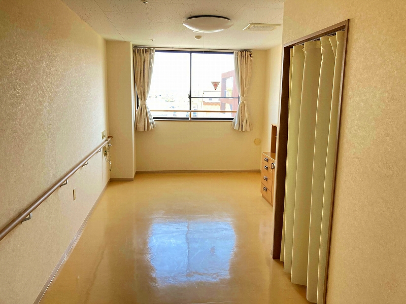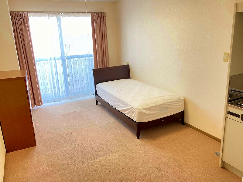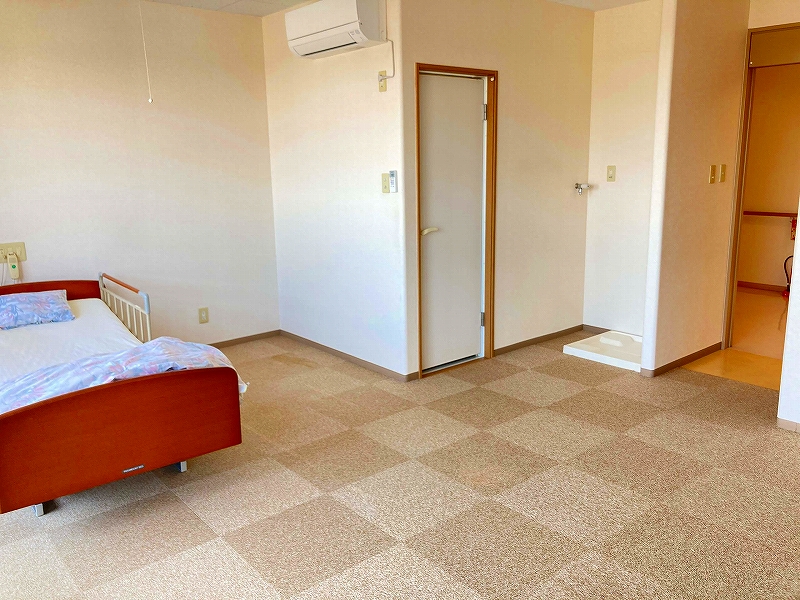 居室設備:地上波デジタルアンテナ、電話回線、ミニキッチン、電磁調理器 、玄関引き扉、下駄箱、タンス、手すり、フローリング、防災設備、ナースコール、空調換気設備、照明器具、間接照明、エアコン、電動介護ベッド、カーテン、防火カーテン、鍵、寝具一式
