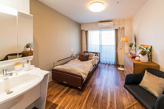 居室設備:トイレ、洗面、介護用別途、ナースコール、エアコン、カーテン、照明、クローゼット、スプリンクラーtv端子、電話端子ロケット