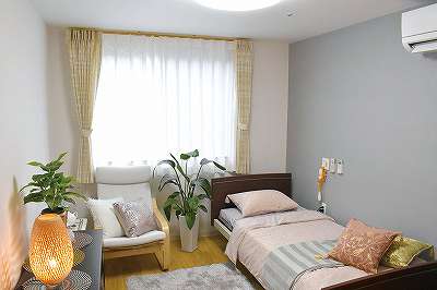 居室設備:テレビ回線, エアコン, クローゼット, 防災設備, 空調換気設備, 照明器具, 電動介護ベッド, カーテン, 寝具, 洗浄機能付トイレ(車いす対応・緊急コール付), 車椅子対応洗面化粧台, 介護用電動介護ベッド