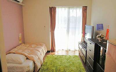 居室設備:エアコン、照明器具、スプリンクラー、緊急通報装置、トイレ、洗面、収納、バルコニー
