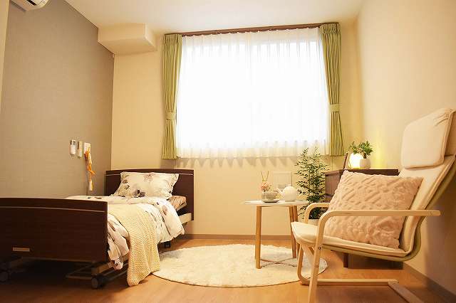 居室設備:ALSOKセキュリティ, 緊急通報装置, テレビ回線, エアコン, クローゼット, 防災設備, 空調換気設備, 照明器具, 電動介護ベッド, カーテン, 寝具, 洗浄機能付トイレ(車いす対応・緊急コール付), 車椅子対応洗面化粧台
