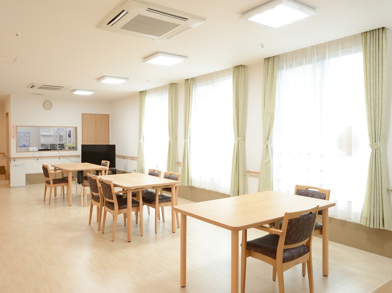 居室設備:介護ベッド、洗面台、トイレ、エアコン、照明、カーテン、TV端子、電話ジャック