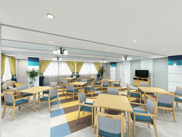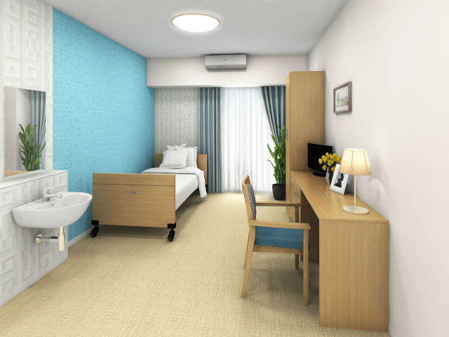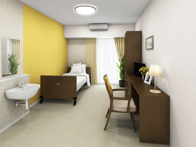 居室設備:介護ベッド、洗面台、収納、トイレ、エアコン、照明、TV端子、電話、インターネット接続端子、緊急通報装置、スプリンクラー