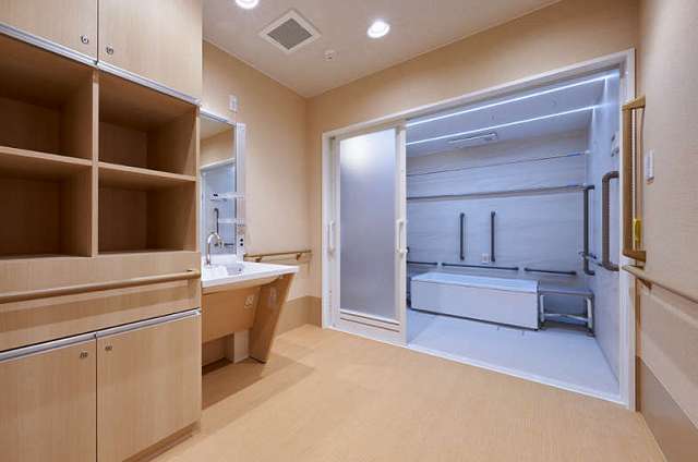居室設備:トイレ、洗面化粧台、緊急コール、スプリンクラー、電話端子、テレビ端子、エアコン、介護ベット、ワードロープ、枕頭台