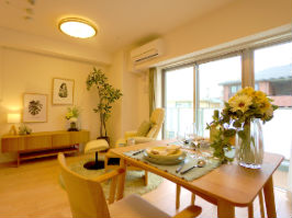 居室設備:キッチン、浴室暖房乾燥機、洗面室、温水洗浄暖房便器付トイレ、玄関ベンチ、クローゼット、エアコン、床暖房、水道流量センサー、緊急通報装置、カラーモニター付きインターホン