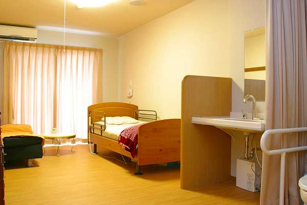 居室設備:トイレ、洗面台、介護ベッド、エアコン、緊急通報装置、人感センサー、スプリンクラー