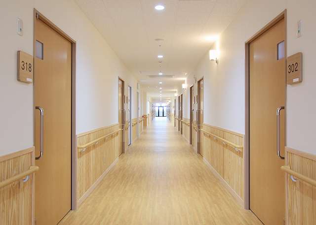 居室設備:エアコン、ナースコール、収納棚、トイレ、洗面台、ベット、イス、ワードロープ、チェスト、カーテン、スプリンクラー
