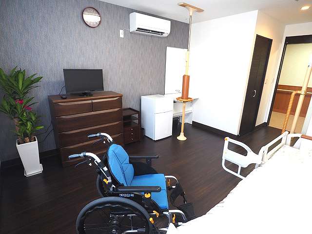 居室設備:トイレ、車いす対応洗面台、収納、エアコン、照明器具、ナースコール、カーテン、時計、ごみ箱