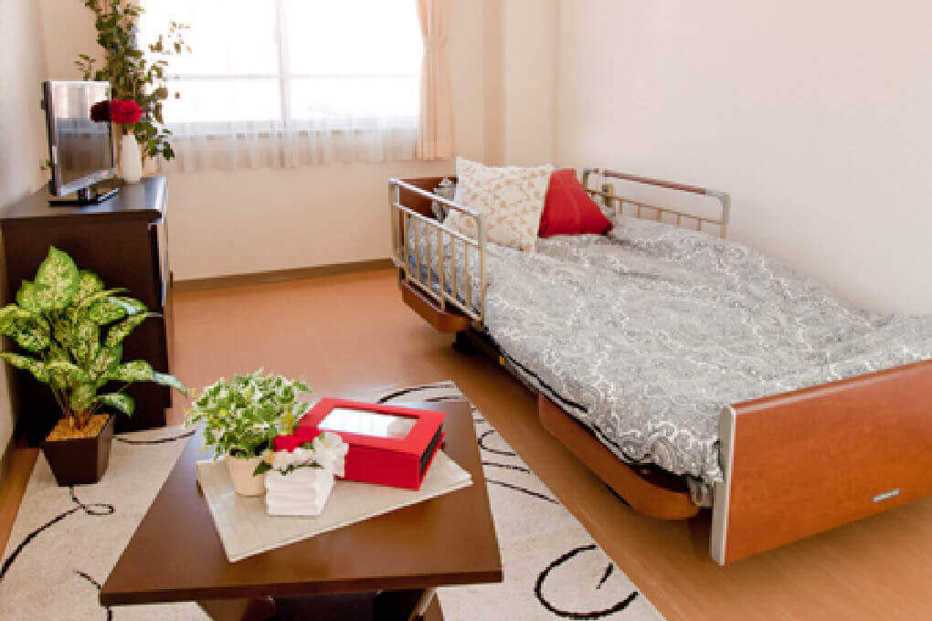居室設備:温水洗浄機能付トイレ、洗面台、ケアコール、カーテン、冷暖房、介護用電動ベット