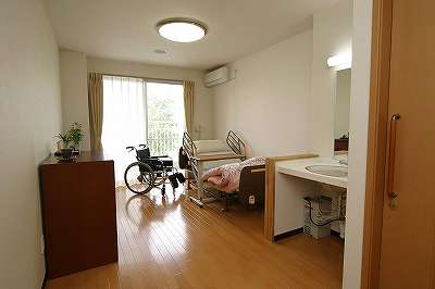 居室設備:エアコン、キッチン、クローゼット、シャワー、トイレ、ナースコール、フローリング、引き戸式ドア(居室内)、引き戸式ドア(玄関)、化粧洗面台、鏡、玄関インターホン、電気給湯器、電話回線、物干しベランダ、防災設備、浴室