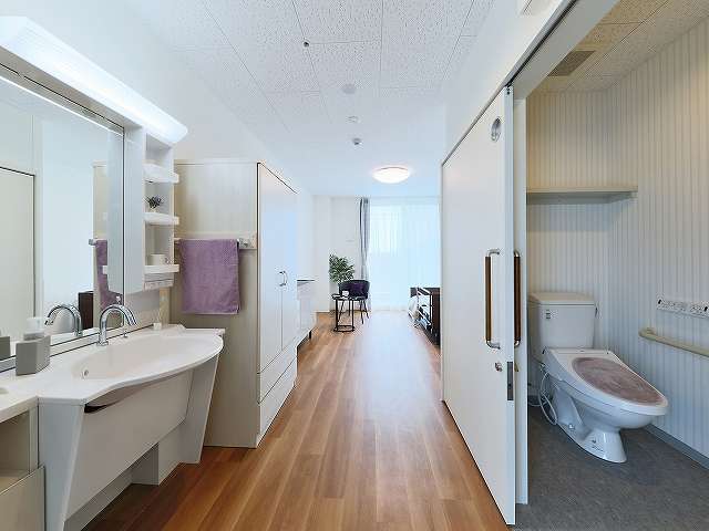 居室設備:エアコン、福祉対応型温水洗面台、洗浄機能付きトイレ、介護ベッド、緊急用コールボタン、収納