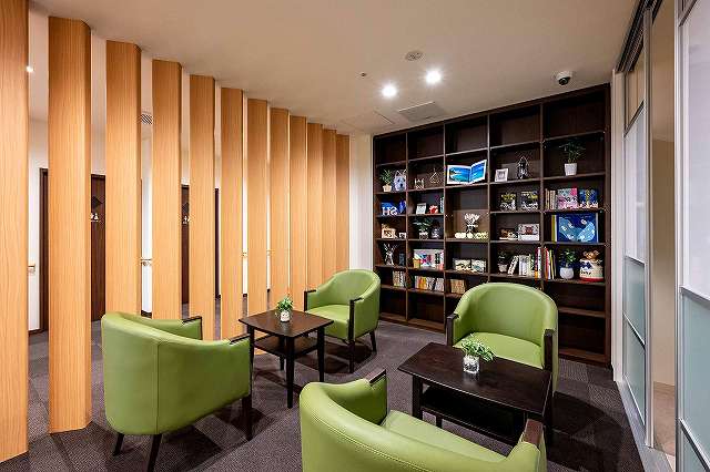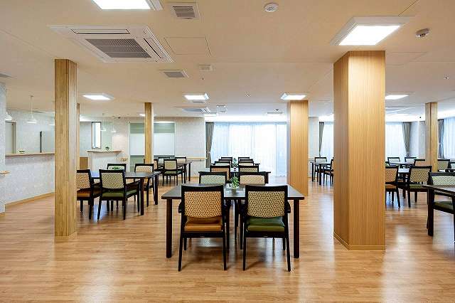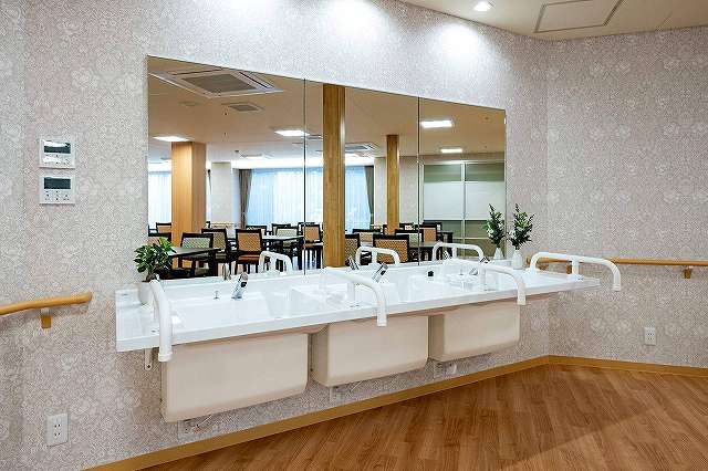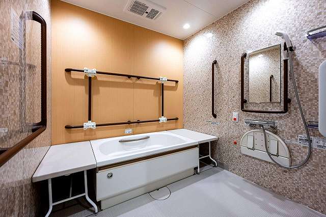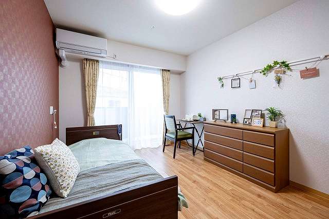 居室設備:冷暖房設備、緊急通報設備(2箇所)、介護用電動ベッド、温水洗浄機能付トイレ、洗面台、照明器具、防炎レースカーテン、クローゼット、ローチェスト、スプリンクラー
