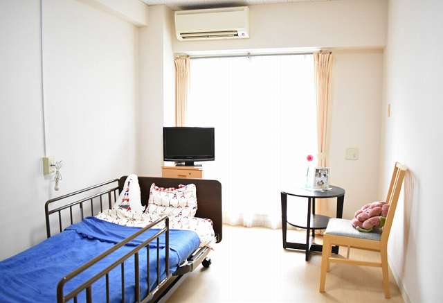 居室設備:ALSOKセキュリティ, テレビ回線, エアコン, クローゼット, 照明器具, カーテン, チェスト, 介護用電動介護ベッド