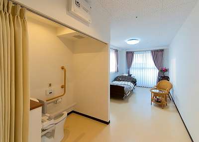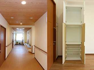 居室設備:トイレ、浴室(一部居室を除く)、洗面台、収納、エアコン、照明、緊急コール(居室、トイレ、浴室に設置)備え付け家具(ベッド、テーブル、椅子、チェスト、ロッカー)