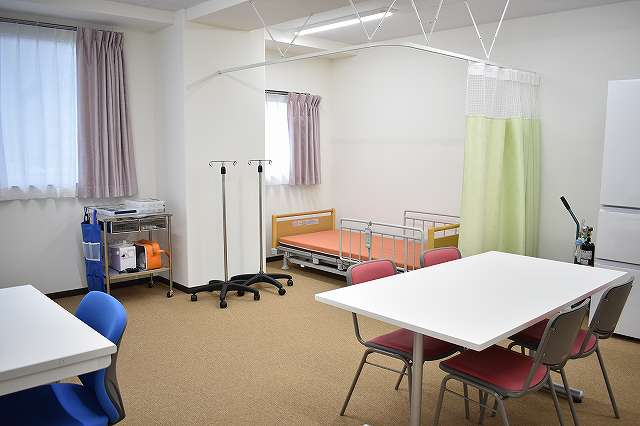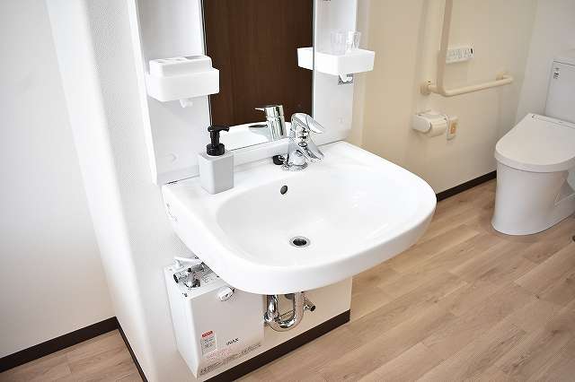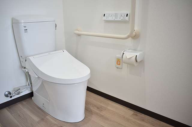 居室設備:スプリンクラー、防災カーテン、緊急コール、介護専用電動ベッド、車いす対応洗面台、温水洗浄トイレ、エアコン、収納