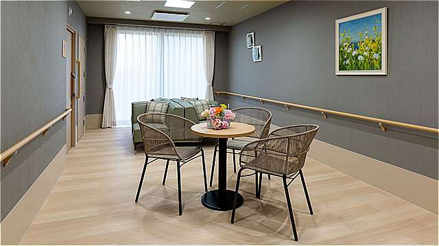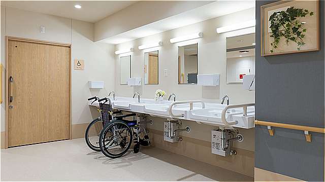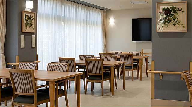 居室設備:介護ベッド、エアコン、クローゼット、カーテン、照明器具、トイレ、洗面台、緊急コール等