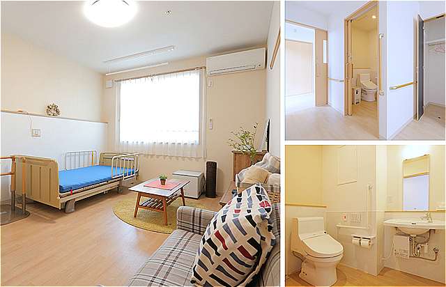 居室設備:車椅子対応トイレ、エアコン、クローゼット、ナースコール、TV配線、 照明器具、室内干し、電気温水器