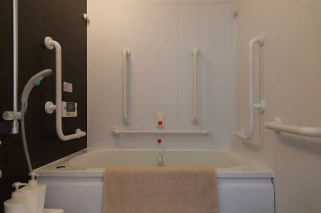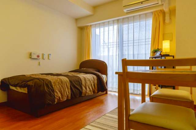 居室設備:洗面、暖房便座付トイレ、緊急呼出装置、収納、下駄箱、浴室、ミニキッチン、洗濯機スペース、固定電話設置可能、玄関収納椅子、エアコン