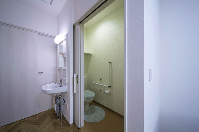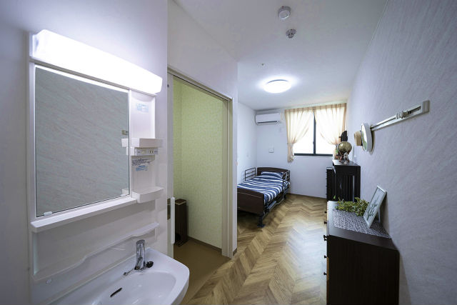 居室設備:エアコン、ナースコール(居室・トイレに各1ヶ所)、防火カーテン、照明器具