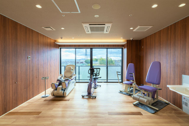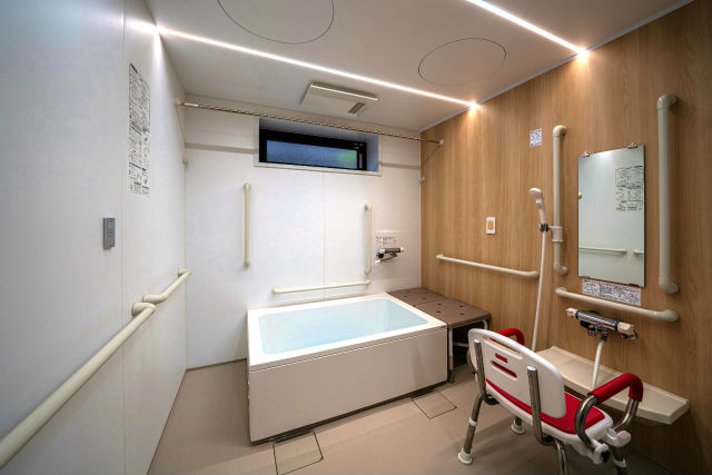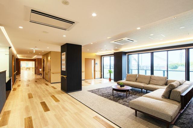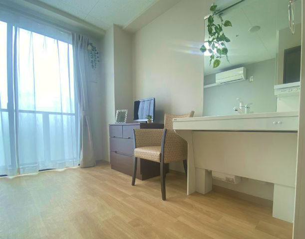 居室設備:ベッド、エアコン、洗面台(鏡付)、洗浄機能付トイレ、室内照明、緊急時コールボタン、収納(タンス)、クローゼット、カーテン、布団、タオル