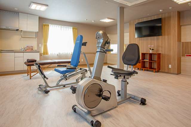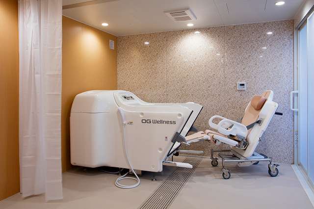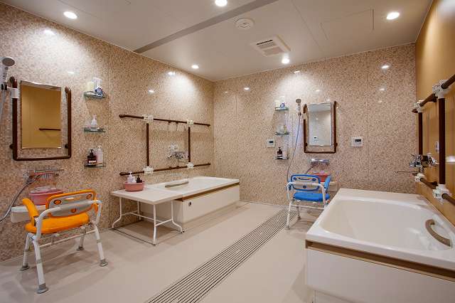 居室設備:電動介護ベッド、感圧センサーウォシュレット付きトイレ、エアコン、緊急コール、洗面台、防火カーテン、スプリンクラー、地上波アンテナ、照明器具