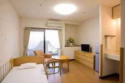 居室設備:ケーブルテレビ回線、電話回線、床頭台、収納棚、収納スペース、手すり、フローリング、ナースコール、照明器具、フットライト、冷蔵庫、テレビ、エアコン、電動介護ベッド、防火カーテン、鏡、寝具一式、温水洗浄機能付きトイレ、車椅子対応トイレ、車椅子対応洗面化粧台、避難設備