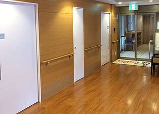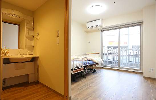 居室設備:洗浄付便器、洗面器、ナースコール、レースカーテン、収納庫、エアコン、シーリングライト
