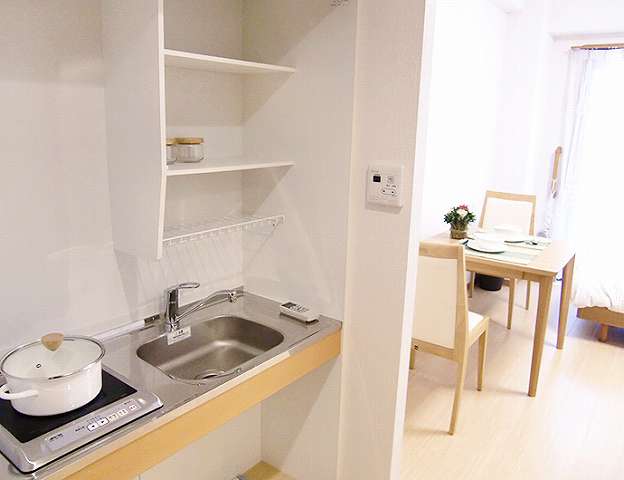 居室設備:トイレ、洗面台、エアコン、スプリンクラー、ベット、浴室、自動火災報知設備、放送設備、暖房洗浄機能付トイレ、洗濯機置き場、車椅子対応IHクッキングヒーター付ミニキッチン、照明器具