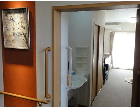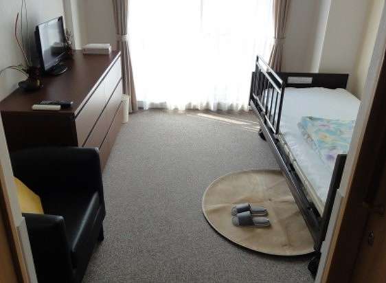 居室設備:介護用ベッド(3モーター)、カーテン、スタッフコール、クローゼット、照明、エアコン、ウォシュレット付トイレ、チェスト、液晶テレビ