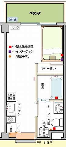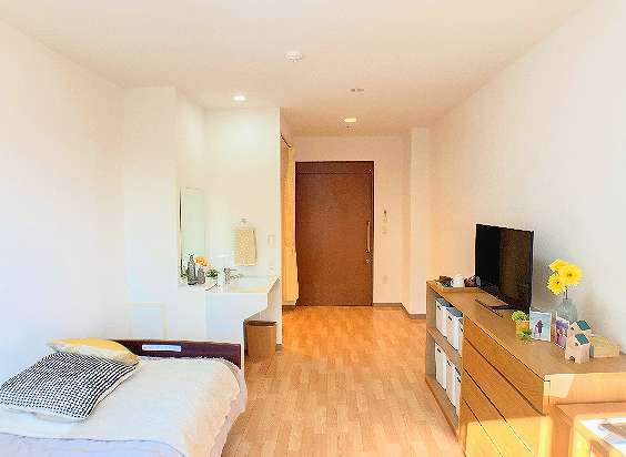 居室設備:水洗トイレ(手すり付き)浴室(シャワー、手すり付き)、給湯設備、洗濯機置場、洗面化粧台、緊急通報ボタン(寝室、浴室、トイレの3カ所)、インターホン、キッチン(IHコンロ)、玄関ベンチ、下駄箱、クローゼット、エアコン、スプリンクラー