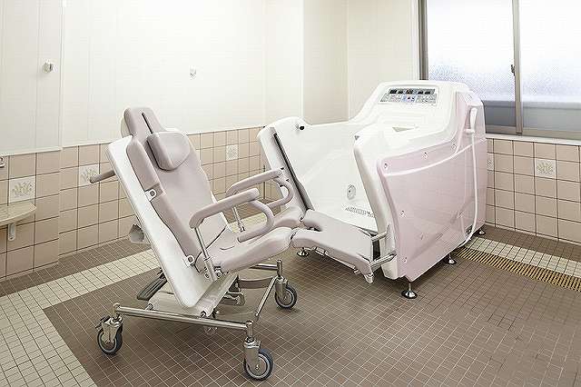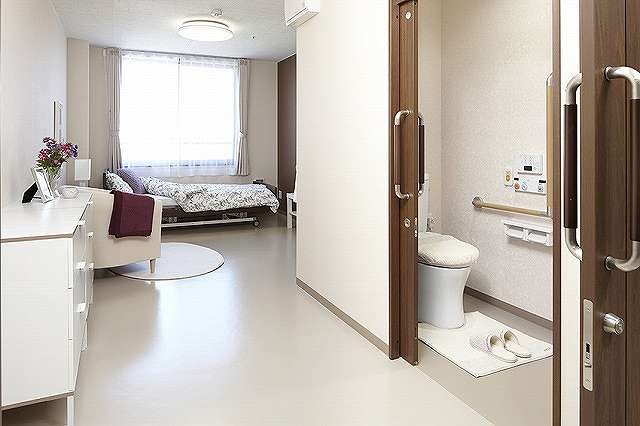 居室設備:洗面台、温水洗浄便座付トイレ、エアコン、電灯、介護ベット、布団一式、カーテン完備