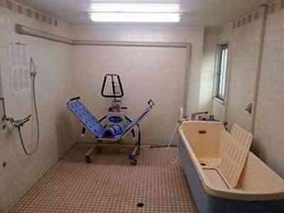 居室設備:介護専用電動ベッド、車イス対応洗面台、収納、ナースコール、防炎カーテン、スプリンクラー、エアコン、緊急コール、見守りカメラ、暖房便座トイレ