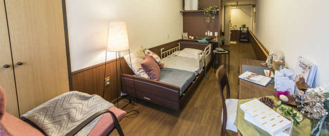 居室設備:介護ベッド、ウォシュレットトイレ、空調設備、空気清浄機、洗面設備、収納、緊急通報装置、スプリンクラー、照明器具