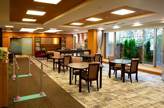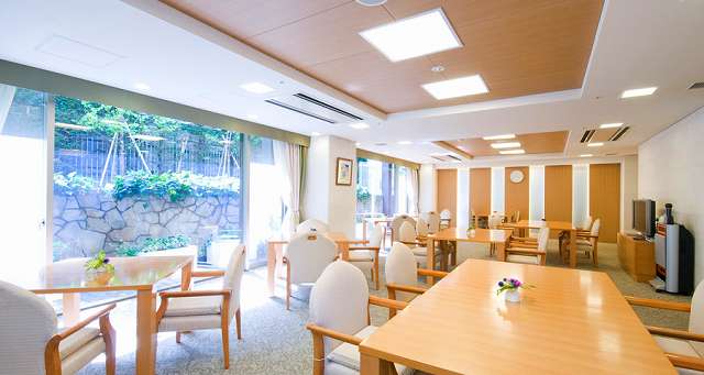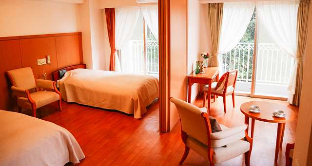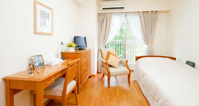 居室設備:家具(チェスト・テーブル・いす)、カーテン(レース・ドレープ)、エアコン、クローゼット、介護対応型電動ベッド(寝具付)、ナースコール、車いす対応洗面台、温水洗浄機能付きトイレ、シューズボックス、玄関ディスプレイボックス