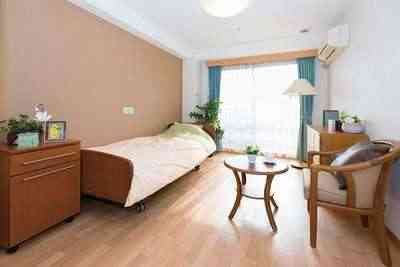 居室設備:介護ベッド、床頭台、ウォシュレット、洗面台、収納、エアコン、カーテン、TV端子、電話ジャック
