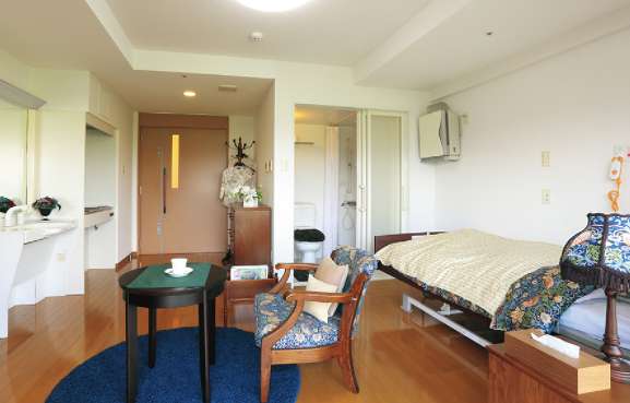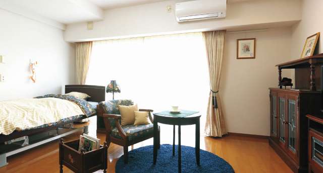 居室設備:ミニキッチン、玄関引き戸扉、床暖房、フローリング、フラットフロア、ナースコール、空調換気設備、照明器具、エアコン、空気清浄器、電動介護ベッド、カーテン、寝具一式、温水洗浄機能付きトイレ、洗面化粧台、シャワー
