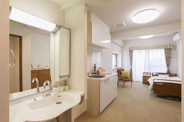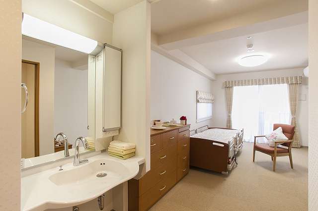 居室設備:トイレ、洗面化粧台、バルコニー、エアコン、クローゼット、チェスト、椅子、介護ベッド、カーテン