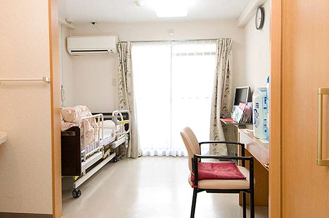 居室設備:ケアコール(ハンディコール)、エアコン完備、温水洗浄機能付トイレ、介護用電動ベッド(寝具付)